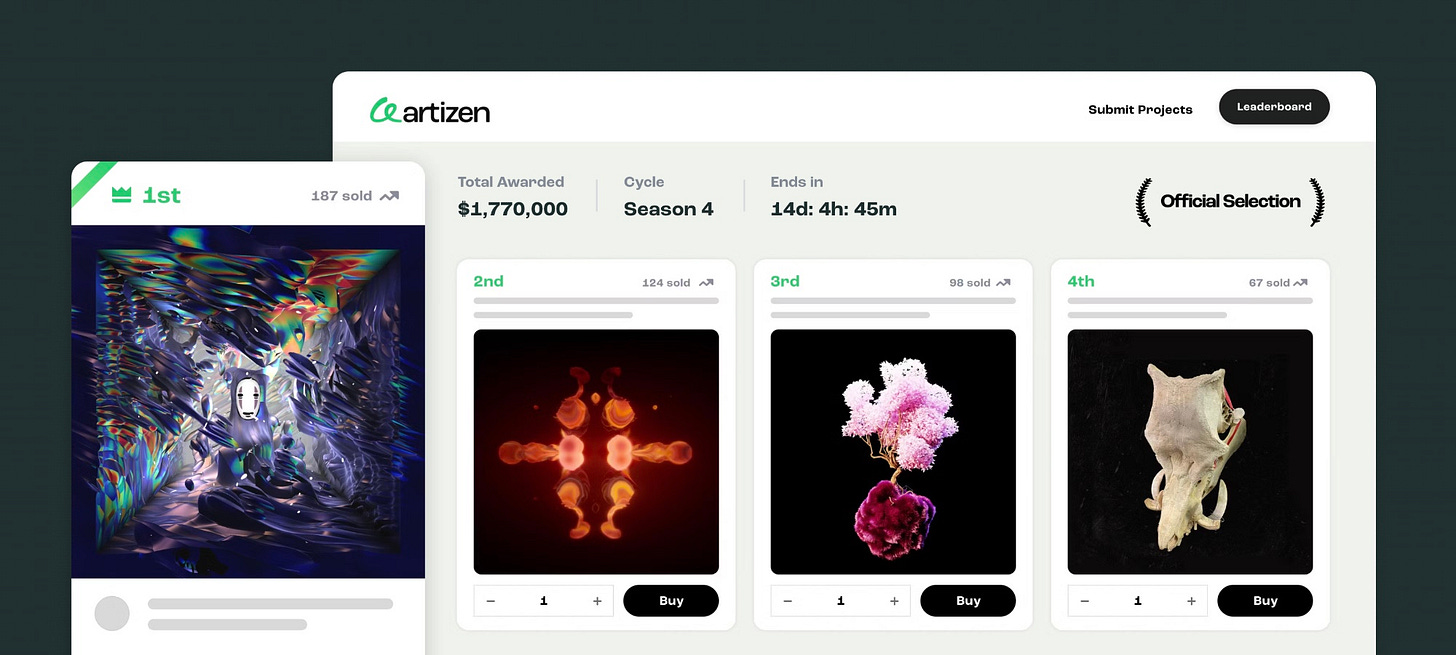 Now, in Season 4, Artizen is cooking. Our members cast 1.4 million votes to curate 158 remarkable projects like Echos of the Heart, City of Apparition, Futuro Nativo, synth-e-sthesia, Sexilio, The Land I Live On, Palestinian Lullabies, Flow, Social Layer, Inter-Woven, CharmVerse, Node Archives, Bone Conductive Instrument, Remembering to Forget, and Earths to Come. It’s our strongest lineup yet, and I’ve got a good feeling creators will raise over $1,000,000 by season’s end.