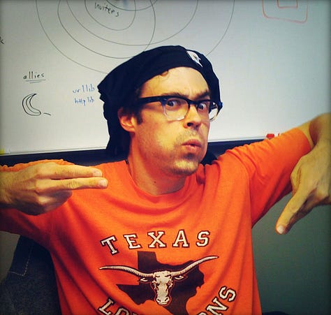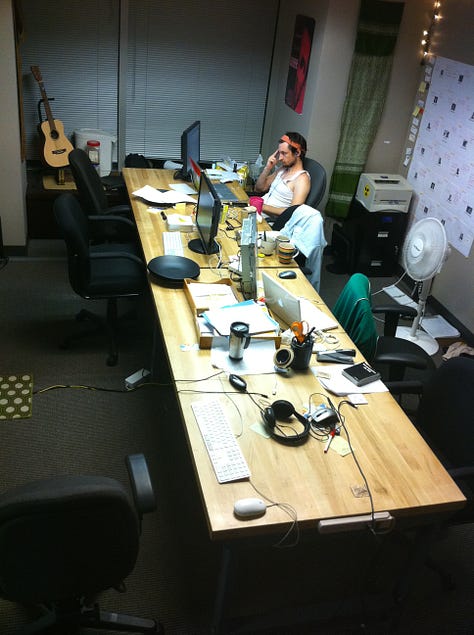 Titans of the Austin tech scene—Josh Baer, Mikey Trafton, Russell Hinds, Jason Cohen—cram hard-earned startup lessons through our thick skulls with a sledgehammer. 72-hour work sprints, sleeping under the desk. Our office has no AC after 5 p.m. and none on weekends. Texas, in summer. By Sunday, we’re all in our underwear, sweating it out. The air barely moves—if anyone farts, it just hangs there. We call it “baby pants.” Gross, miserable, but the intensity is addictive.